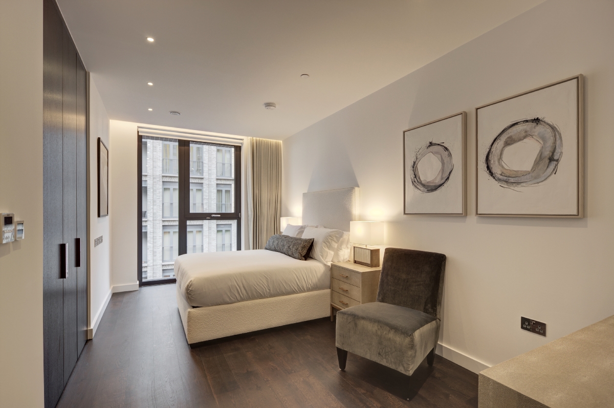 The apartment comprises a spacious reception room with Samsung Smart TV's with Bose sound bars incorporating a built in Amazon Alexa to control the reception room lighting, TV, heating systems and electric privacy curtains along with a private balcony. The reception room is open plan to a fully fitted kitchen featuring integrated Miele appliances and Hot Tap with floor to ceiling windows.